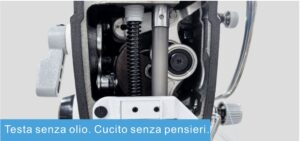 Solo il crochet è lubrificato ma la vaschetta dell’olio è sigillata, evita quindi l’ingresso di polvere, mantenendo la macchina pulita e resistente, garantendo una perfetta lubrificazione.