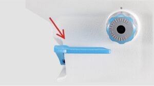 La leva della fermatura è di facile accesso è più leggera e puo’ essere premuta con il gomito lasciando libere entrambe le mani.